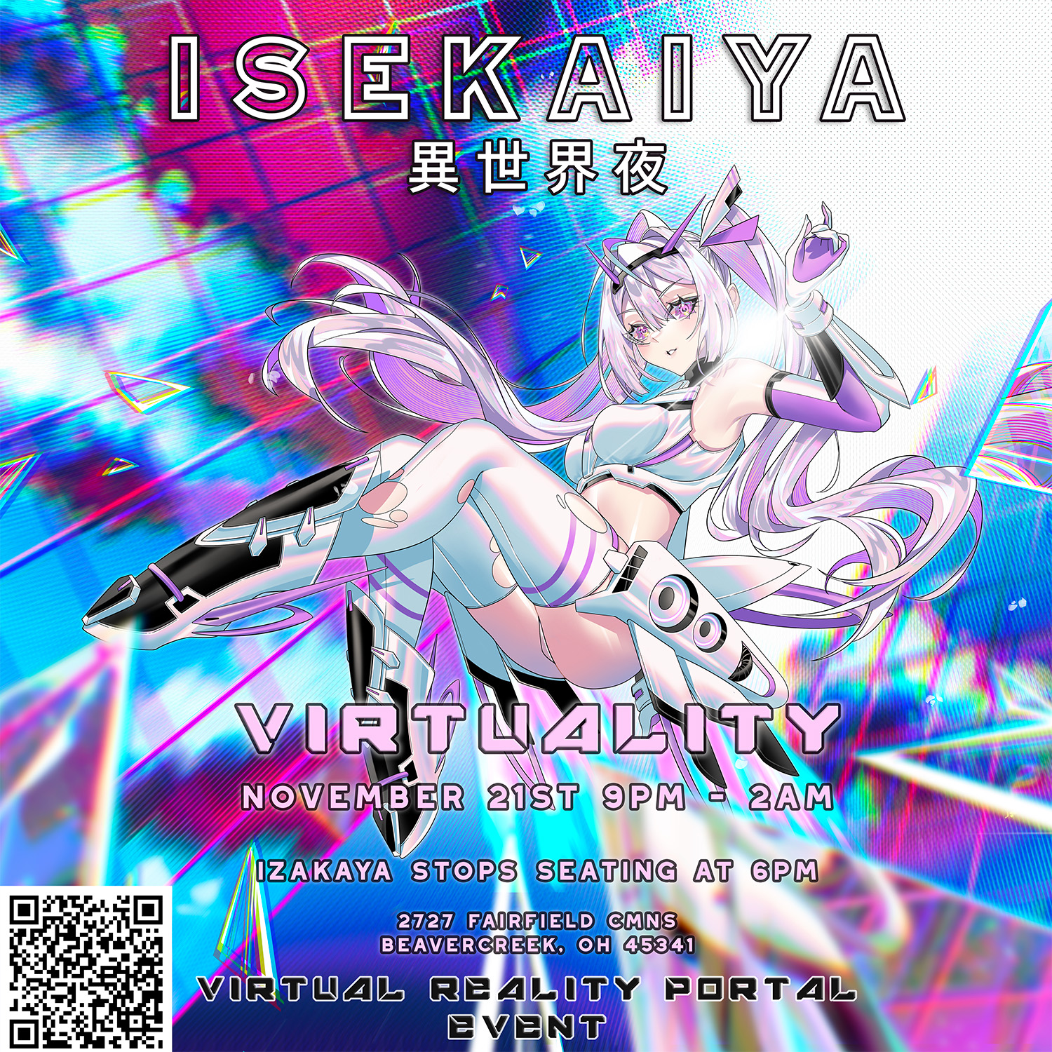 IZAKAYA 2727 Fairfield Commons, Beavercreek] Tickets are over 60% sold out! VRChat Group: ISEKAI.4490 You will need to join the above group to gain access to the VRChat instance! If you are planning on attending in VR, purchasing a ticket is not necessary! For VIRTUALITY, we’re bringing two realities together. The physical IZAKAYA in Dayton, and its 1:1 virtual...